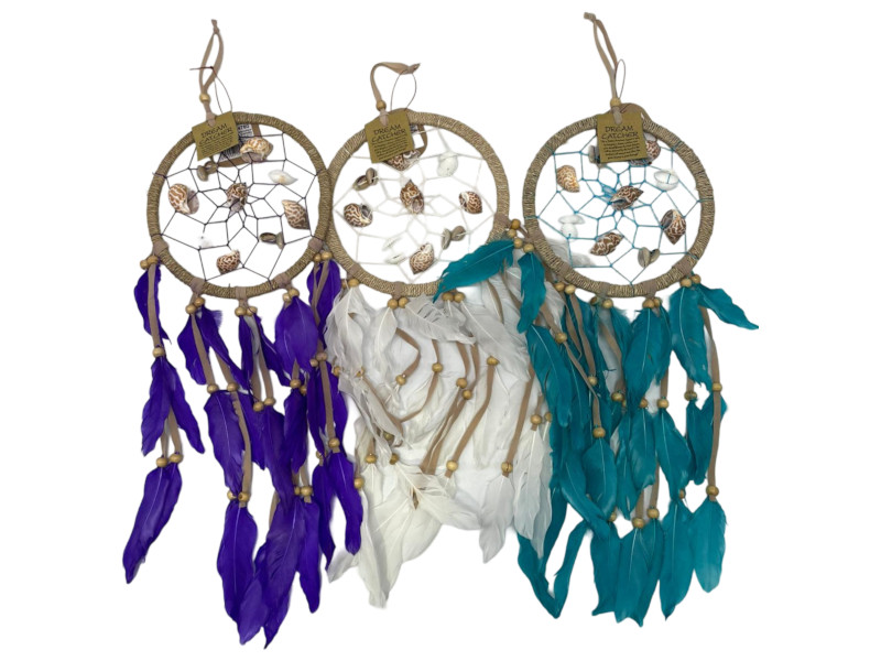 Atrapasueños decorativos de 16 cm con caracolas naturales, plumas suaves y cuentas de madera. Perfectos para dar un estilo bohemio con inspiración marina. Vienen en colores surtidos: lila, blanco y turquesa.
