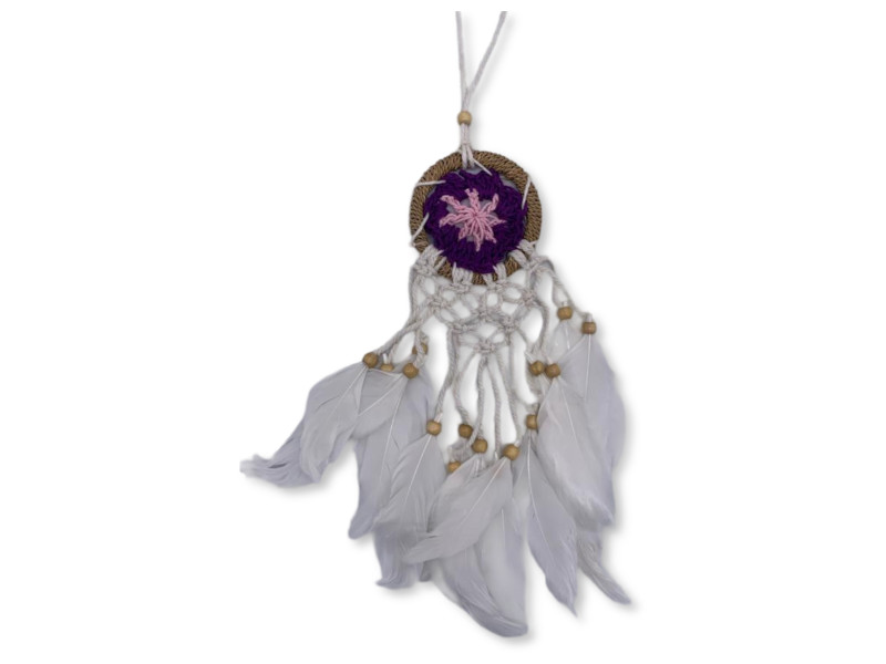 Este pequeño atrapasueños de 6 cm destaca por su mandala central tejido a mano en un vibrante tono violeta con detalles rosados, enmarcado en un aro de yute natural. La parte inferior presenta un delicado entramado de macramé acompañado de plumas blancas y cuentas de madera, que aportan textura y movimiento. Ideal para rincones íntimos o como colgante decorativo en espacios pequeños.