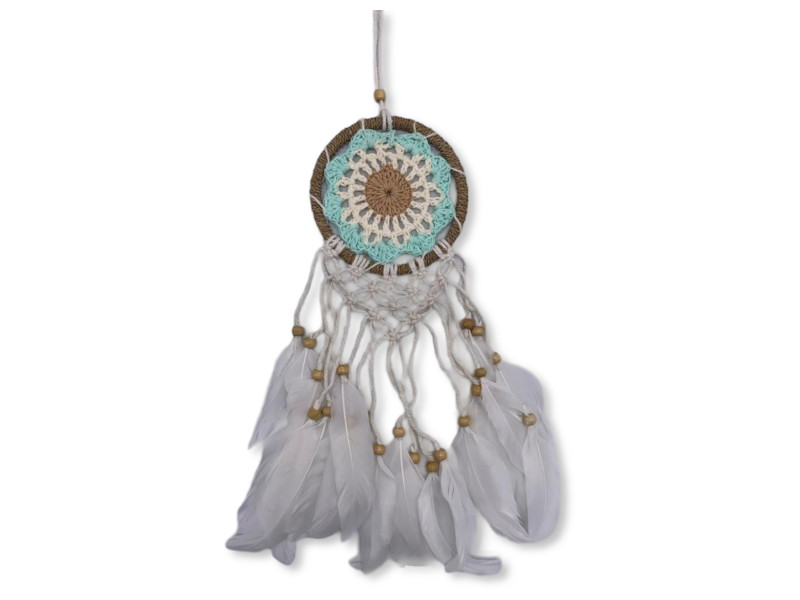 Este modelo presenta un delicado mandala central tejido en tonos beige, blanco y celeste, rodeado por un aro cubierto con hilo de yute natural. El entramado inferior de macramé sostiene múltiples plumas blancas suaves, adornadas con cuentas de madera clara. Una pieza sutilmente colorida y natural, ideal para espacios relajantes.