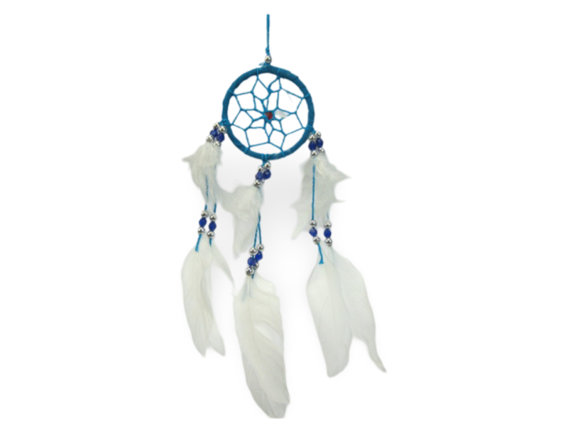 Atrapasueños de 6 cms con aro en color azul profundo, decorado con plumas blancas y múltiples cuentas azules brillantes. El centro presenta un diseño geométrico llamativo con detalle rojo. Perfecto para colgar en habitaciones, entradas o espacios con estilo colorido y original.