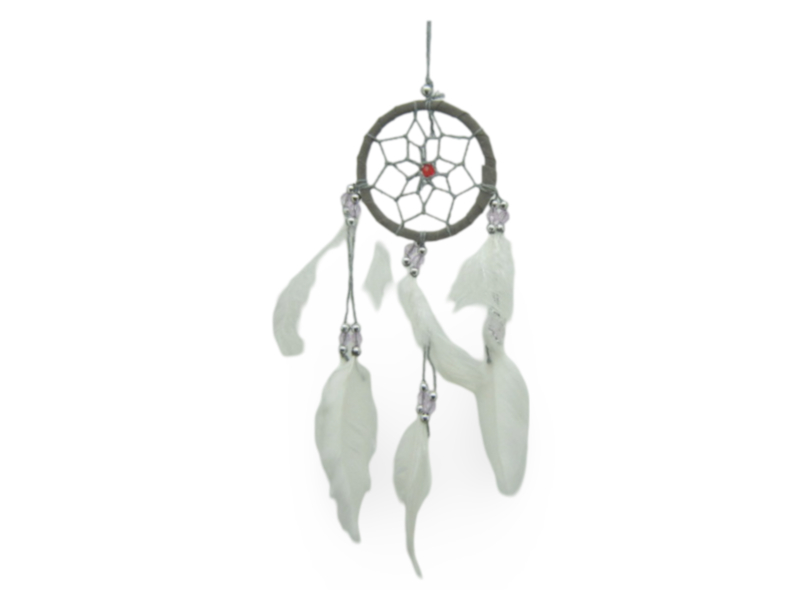 Atrapasueños gris con plumas blancas y detalle rojo central 6 cm