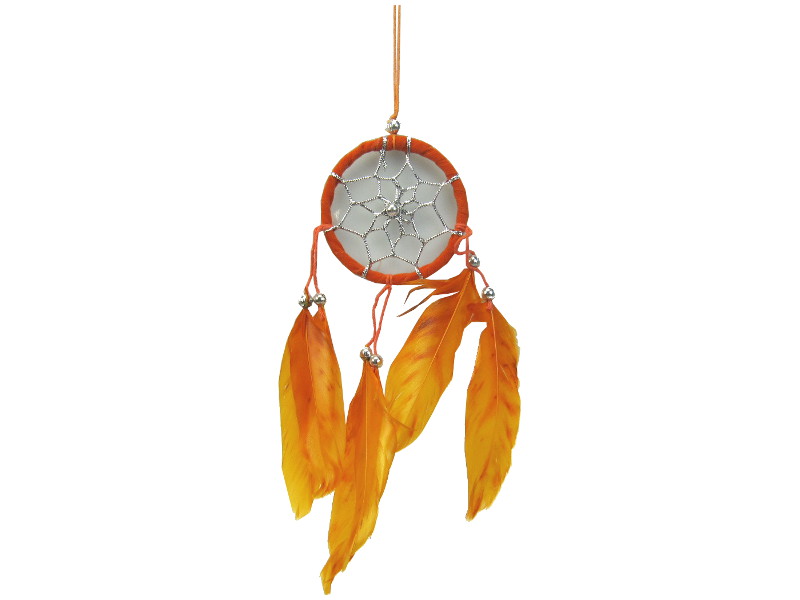 Atrapasueños de 6 cm con aro en color naranja intenso, decorado con plumas a tono y red interior clásica con hilo brillante. Su estilo vibrante lo hace ideal para destacar en retrovisores, estanterías pequeñas o espacios con personalidad.