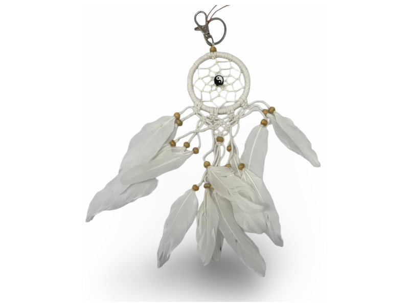Atrapasueños de 6 cm decorado con símbolo central del Yin Yang, plumas blancas y cuentas de madera. Incorpora mosquetón metálico para colgar fácilmente en mochilas, bolsos o espejos retrovisores. Perfecto como amuleto de equilibrio y protección.