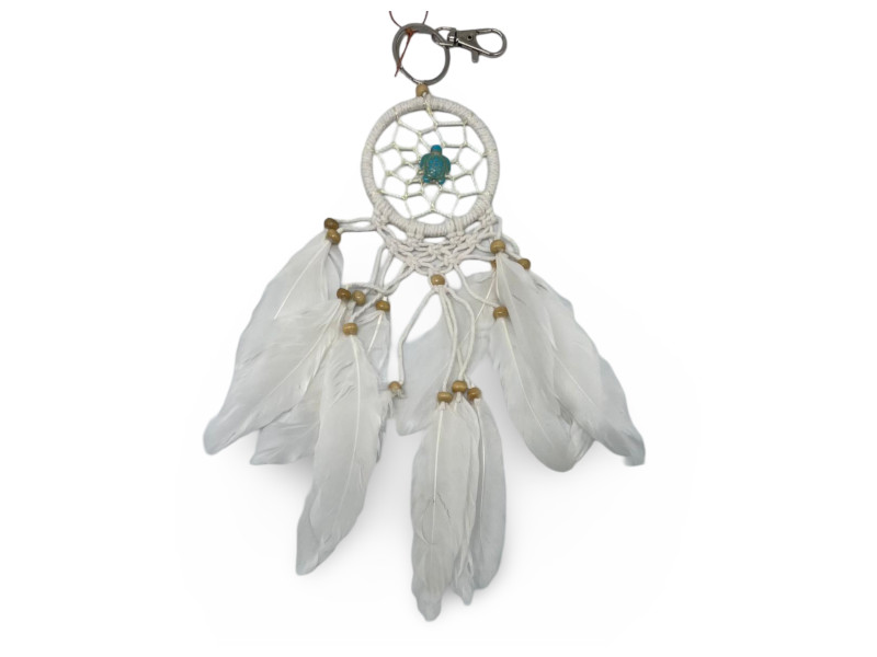 Atrapasueños de 6 cm con figura central de tortuga, plumas blancas y cuentas de madera. Equipado con mosquetón metálico para colgar fácilmente en mochilas, retrovisores u otros espacios. Perfecto como amuleto decorativo y simbólico.