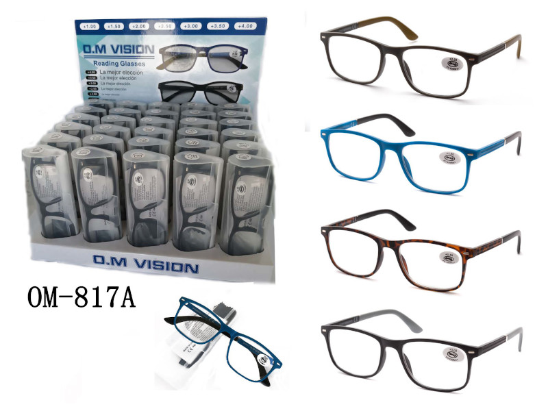 Montura rectangular de diseño clásico con acabado mate y terminales a juego o en contraste. Disponible en colores negro, azul, marrón carey y gris. Incluye estuche rígido transparente y paño de limpieza. Amplia variedad de graduaciones de +1.00 a +4.00.