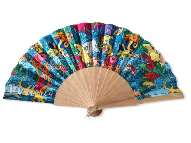 Abanico de madera con diseño marino lleno de peces de colores y detalles de coral. Ideal como recuerdo alegre y colorido de Mallorca.