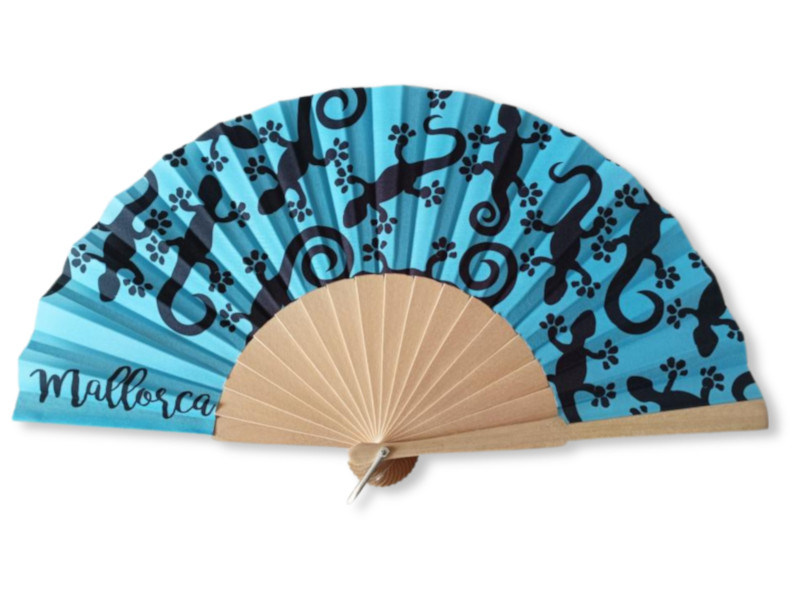 Abanico de madera decorado con un diseño en tonos azules con geckos negros y la palabra «Mallorca». Perfecto como recuerdo o accesorio veraniego.