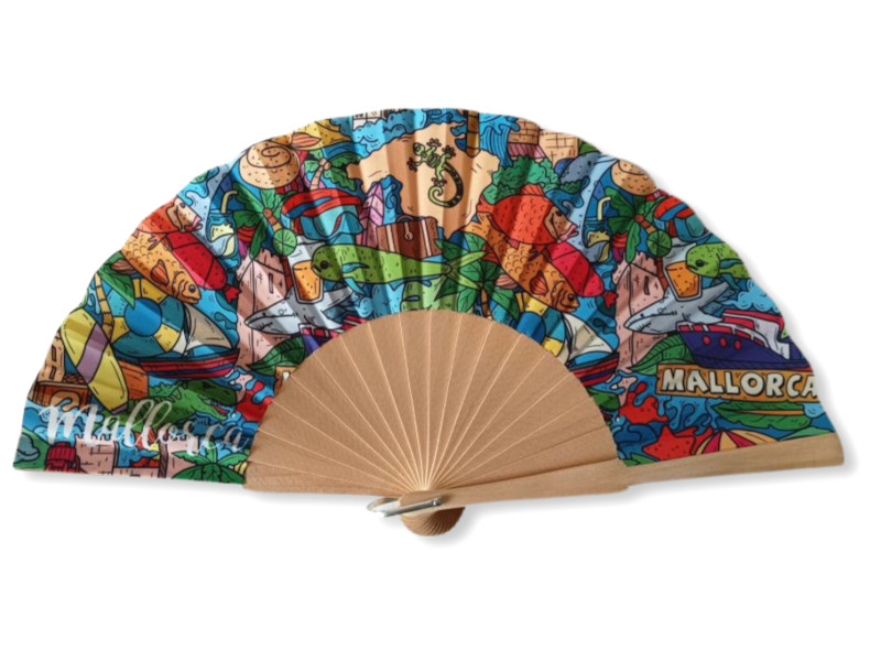Abanico de madera con diseño tipo collage lleno de elementos turísticos típicos de Mallorca: barcos, peces, tortugas, playas y detalles coloridos que capturan el espíritu veraniego de la isla.