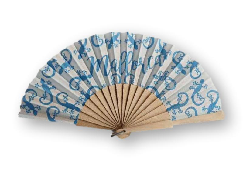 Abanico de madera con diseño en tonos azules sobre fondo blanco, decorado con pequeñas lagartijas y motivos florales en espiral. La palabra “Mallorca” aparece en el centro con una elegante caligrafía, evocando un estilo veraniego y tradicional. Ideal tanto como recuerdo como para uso diario.