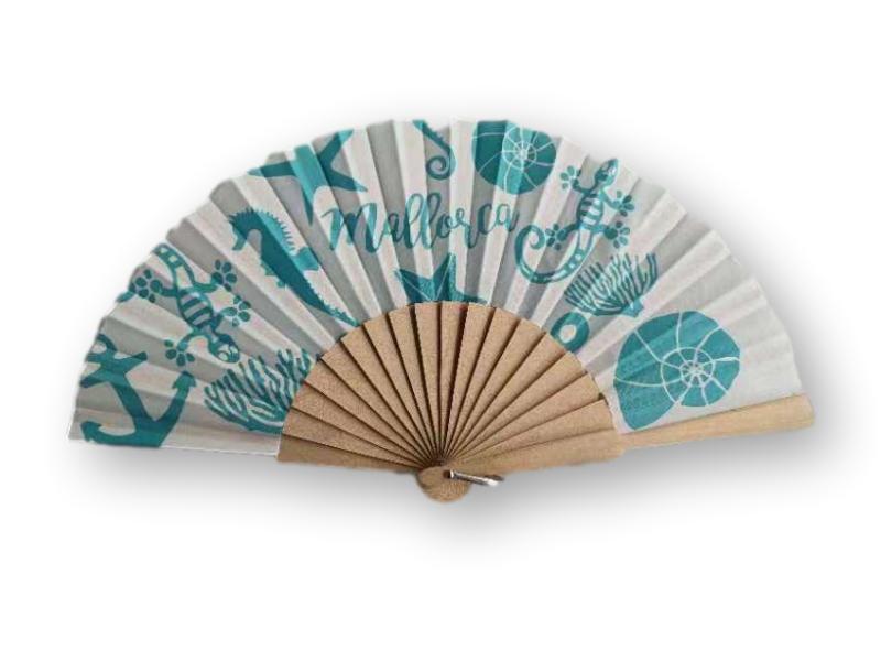 Este elegante abanico de 23 cm está decorado con un diseño marino en tonos azul turquesa que incluye caballitos de mar, conchas, estrellas, corales, geckos y anclas. El fondo claro realza los detalles del estampado y el nombre de «Mallorca» impreso en el centro lo convierte en un bonito recuerdo de la isla. Ideal como detalle veraniego o souvenir.