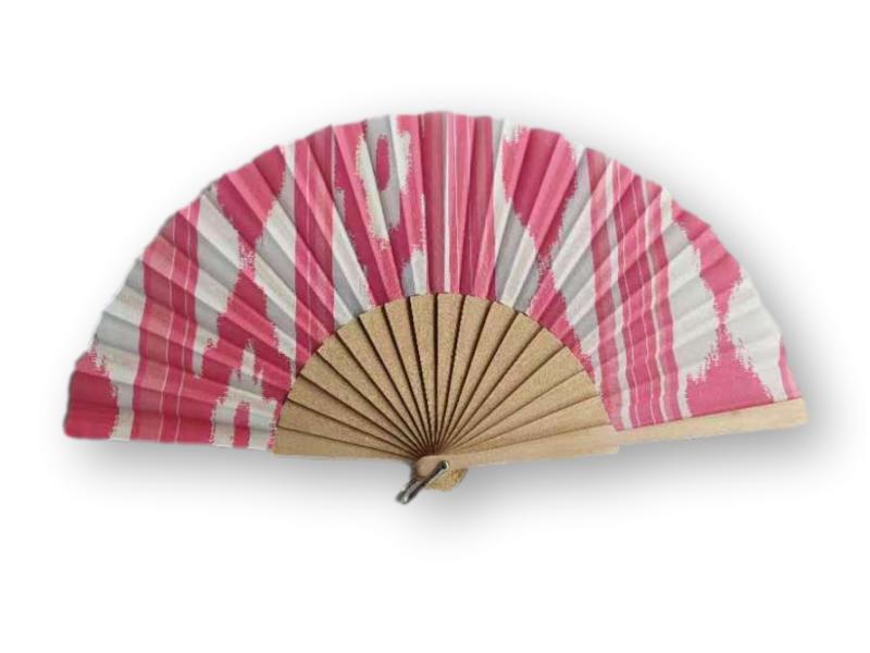 Abanico plegable con varillas de madera natural y tela decorada con el clásico motivo de llengos en tonos rosa desvaído. Una pieza con aire tradicional y encanto mallorquín, ideal como recuerdo o complemento de verano.