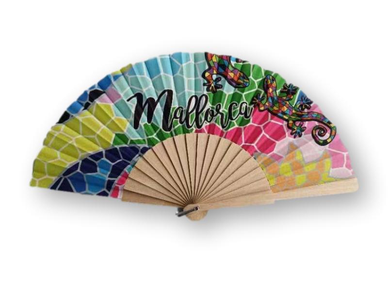 Abanico de madera decorado con un diseño tipo mosaico multicolor, acompañado por dos lagartijas que aportan un aire divertido y mediterráneo. Incluye el texto «Mallorca» en letras negras destacadas. Ideal como recuerdo turístico o regalo original.