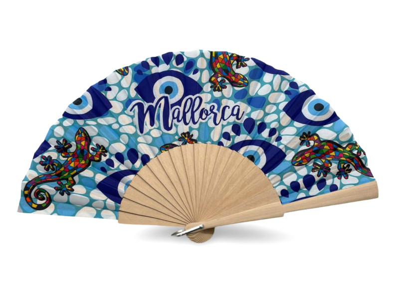 Abanico de madera decorado con el clásico amuleto del ojo turco en tonos azules, acompañado de coloridos lagartos estilo trencadís y el nombre de Mallorca en el centro. Un diseño llamativo que mezcla protección, color y tradición mediterránea.