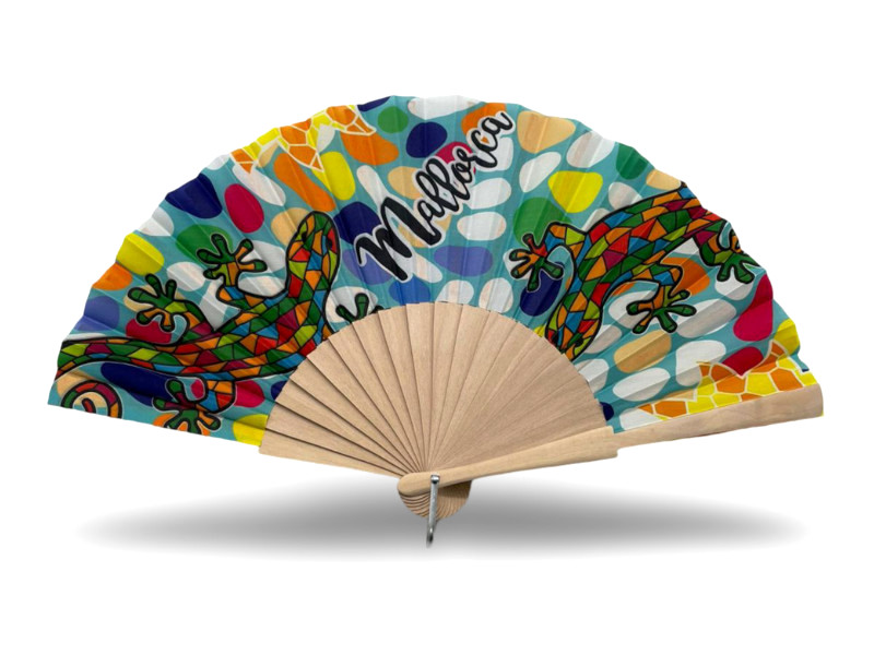 Abanico de madera con dos lagartos tipo trencadís en tonos vivos sobre un fondo de mosaico multicolor. Un diseño moderno, alegre y lleno de energía que representa el espíritu vibrante de Mallorca.