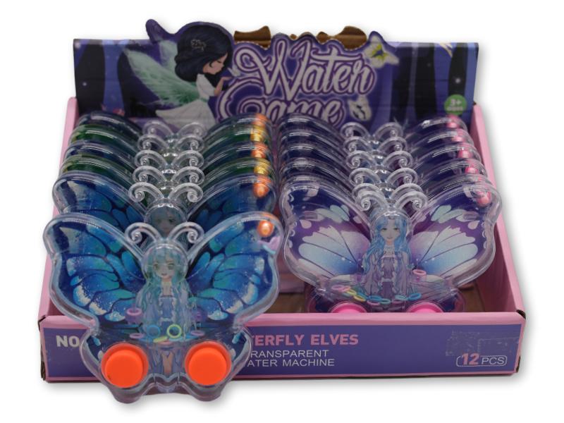 Juego de agua con forma de mariposa y diseño de elfos mágicos. Presiona los botones para lanzar los aros y encajarlos en las clavijas internas. Ideal para desarrollar la coordinación y entretener sin pantallas. Diseños coloridos y temática fantástica. El expositor contiene 12 unidades.