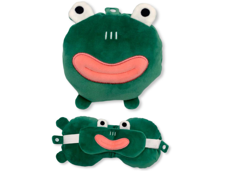 Divertido cojín de peluche con forma de rana verde, detalles bordados y ojos saltones. Incorpora antifaz en la parte trasera, perfecto para descansar en cualquier momento. Pack: 6 unidades