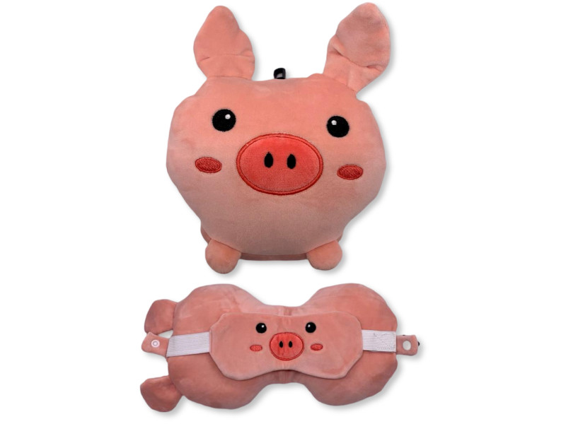 Divertido cojín de peluche con forma de cerdito en color rosa, acompañado de un antifaz a juego ideal para relajarte en cualquier lugar. Pack: 6 unidades.