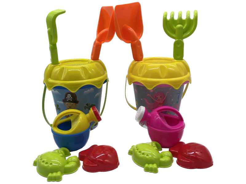 Divertido set de playa con cubo decorado (pirata o sirena), regadera, pala, rastrillo y moldes de animales marinos. Ideal para niños pequeños en la playa o el arenero, fomentando el juego creativo al aire libre.