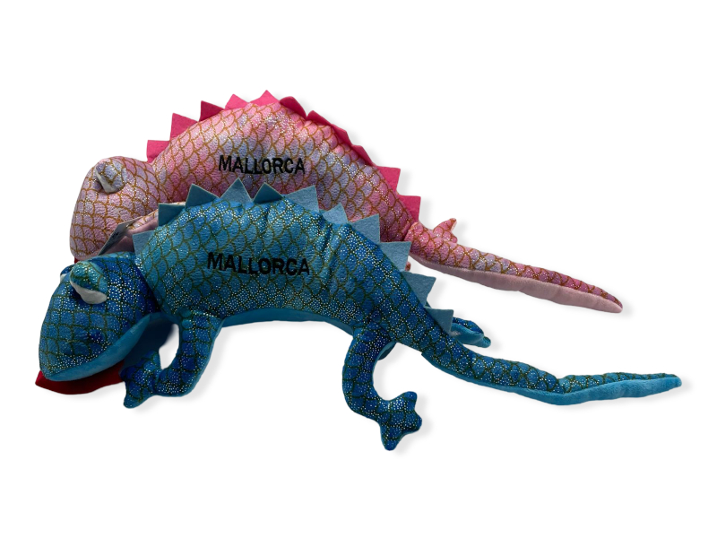 Camaleón de peluche con un diseño llamativo y cuerpo cubierto de escamas brillantes en tonos vivos. Disponible en azul y rosa, ambos con el texto «Mallorca» bordado en el lateral, ideal como recuerdo de la isla o como compañero de juegos. Suave, flexible y muy decorativo. Edad recomendada: a partir de 3 años. Medidas aproximadas: 50 cm de largo. En packs de 12.