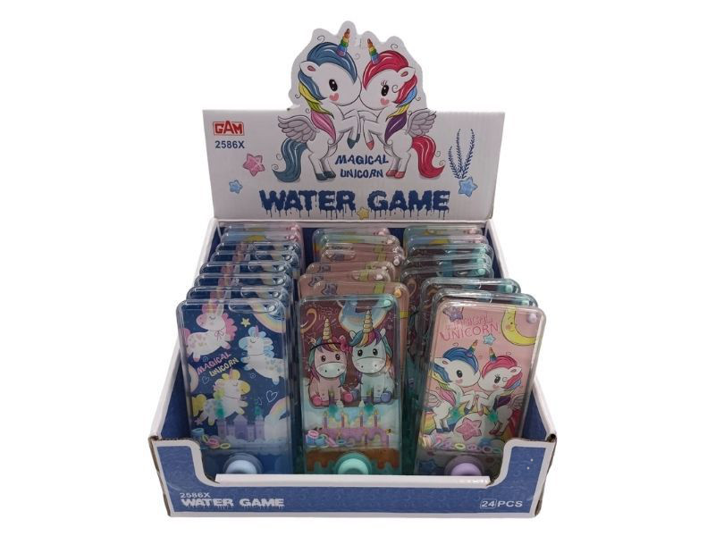 Un clásico juego de agua con botón, decorado con adorables unicornios mágicos. Al presionar el botón, lanza los aros con la presión del agua e intenta encestarlos en las varillas internas.