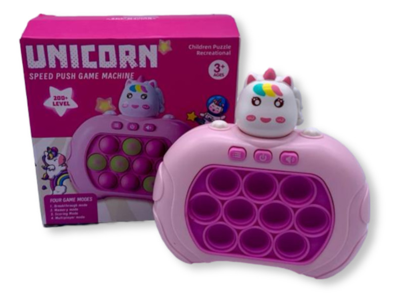 Este juguete combina el clásico Pop It con una experiencia electrónica interactiva. Su diseño en forma de unicornio lo hace especialmente atractivo para los más pequeños. Con más de 200 niveles y luces integradas, es perfecto para mejorar la coordinación y los reflejos. Incluye cuatro modos de juego distintos que ofrecen variedad y entretenimiento. Recomendado para niños a partir de 3 años. Funciona con pilas (no incluidas). Ideal tanto para casa como para llevar de viaje. Set de 3 unidades.
