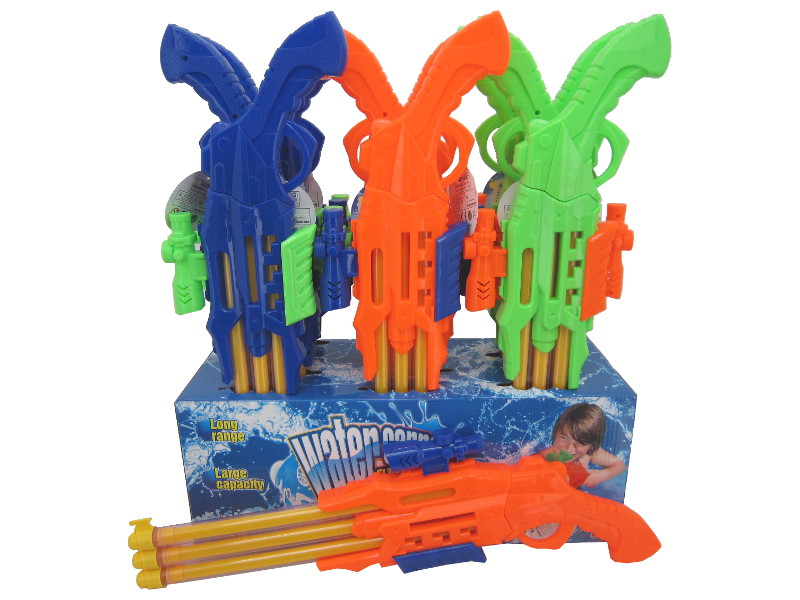 Lanzador de agua con forma de arma futurista, con 4 tubos para mayor alcance y potencia. Incluye detalles de color y diseño llamativo que lo hacen destacar en cualquier batalla acuática.Pack: 12 unidades