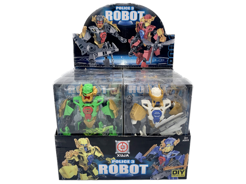 Set de 6 robots armables con diseño futurista, estilo policía galáctico. Cada figura viene en su propio blíster y está compuesta por piezas ensamblables al estilo bloque, lo que permite combinaciones personalizadas. Colores variados y acabados mecánicos que estimulan la creatividad y la motricidad fina. Pack de 6 unidades.