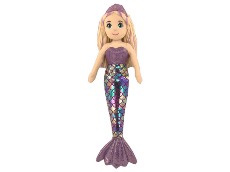 Muñeca sirena suave al tacto con un look encantador. Viste un conjunto de top y cola en tonos morados con escamas brillantes que cambian de color según la luz, además de una diadema a juego. Ideal para jugar o decorar, su diseño es perfecto para fans del mundo marino y mágico. Edad recomendada: a partir de 3 años. Altura aproximada: 30 cm.