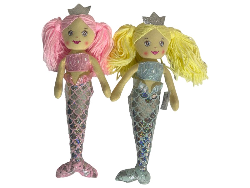 Déjate llevar por la magia del mar con estas preciosas muñecas sirena de tela, decoradas con una brillante cola metalizada y detalles relucientes en su top. Llevan una corona que las convierte en verdaderas princesas del océano, y su pelo de colores pastel trenzado les da un toque único. Se sirven en surtidos de 12 con combinaciones de colores variadas. Edad recomendada: a partir de 3 años. Altura aproximada: 45 cm.