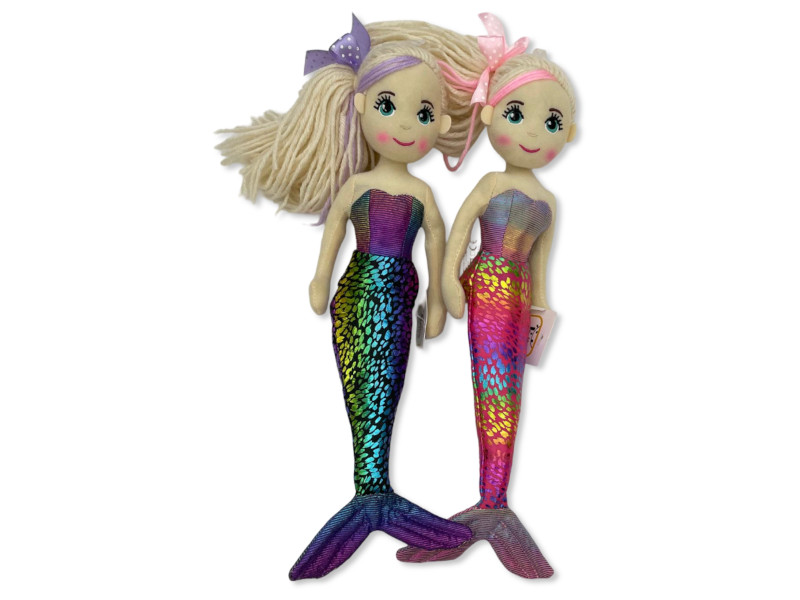 Estas muñecas sirena destacan por sus alegres colores y su encantador peinado con lazo. Llevan un corpiño a juego con una espectacular cola de escamas iridiscentes en tonos vivos que las hace brillar como verdaderas reinas del mar. Perfectas para juegos imaginativos. Se presentan en dos modelos surtidos en packs de 12. Edad recomendada: a partir de 3 años. Altura aproximada: 30 cm.