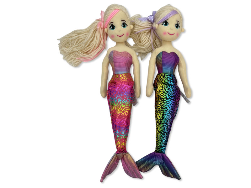 Estas encantadoras sirenas tienen un look moderno con su cabello recogido en una graciosa coleta lateral y un top a juego con su cola brillante. La cola, decorada con escamas iridiscentes multicolor, aporta un toque mágico perfecto para juegos de fantasía acuática. Disponibles en dos combinaciones de colores surtidos de 12 unidades. Edad recomendada: a partir de 3 años. Altura aproximada: 45 cm.