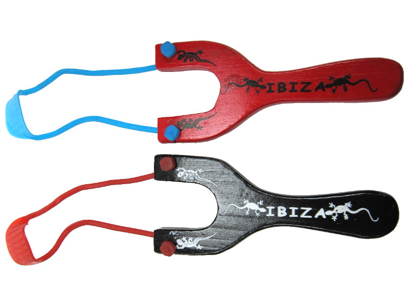 Tirachinas de madera decorado con motivos de lagartijas y la palabra «Ibiza». Mide 18 cm de largo. Goma elástica resistente ideal para juegos al aire libre. Colores surtidos. Pack: 24 unidades.