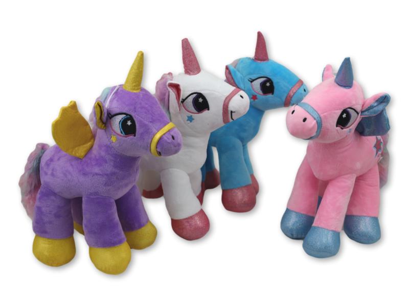 Encantador unicornio de peluche disponible en vivos colores como morado, blanco, azul y rosa, decorado con alas y detalles de estrellas en la cara. Ideal para regalar y acompañar los momentos más dulces de los pequeños. Su textura suave y su acabado brillante lo convierten en el compañero perfecto para soñar. Pack: 4 unidades. Tamaño: 35 cm.