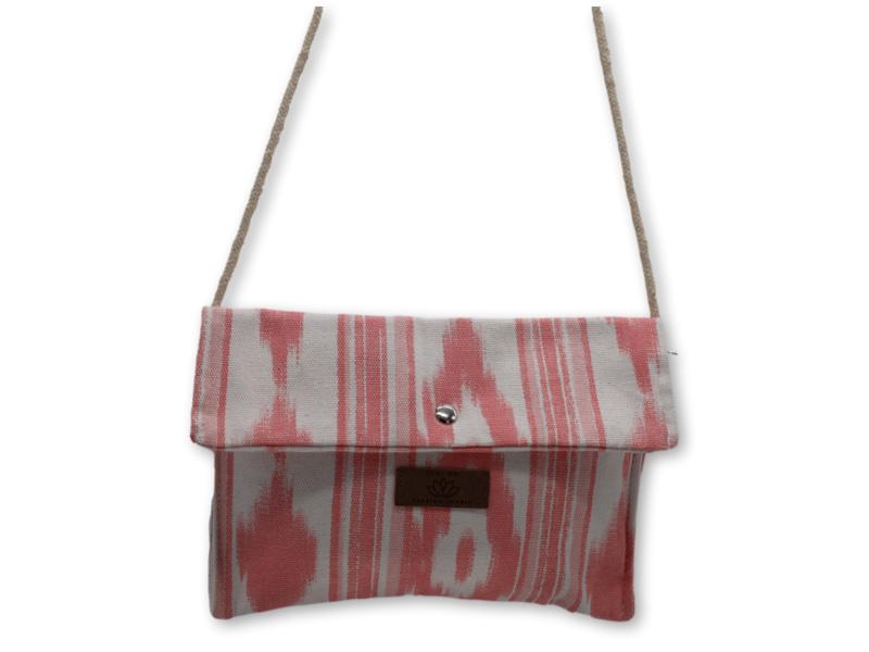 Bolso de 26×17 cm realizado en tejido de llengos mallorquinas en color rosa y blanco. Diseño práctico con cierre de solapa y botón metálico, perfecto para dar un toque fresco y artesanal a tus looks diarios. Incluye cordón para colgar cómodamente. Pack 6 unidades.