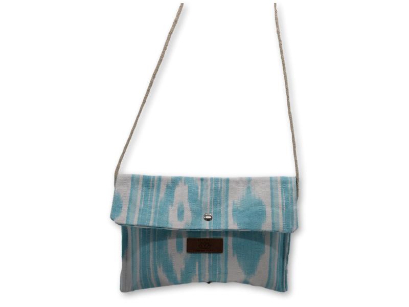 Bolso de 26×17 cm confeccionado en auténtico tejido de llengos mallorquinas en tonos azul celeste y blanco. Perfecto para un look fresco y veraniego, con solapa y cierre de botón metálico, además de cordón fino para llevar al hombro. Pack 6 unidades.