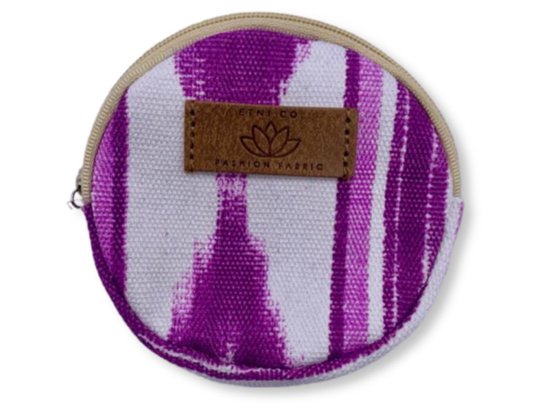 Monedero redondo confeccionado en auténtica tela mallorquina de llengos, con una vibrante combinación de blanco y morado. Su formato circular de 11 cm de diámetro es ideal para guardar monedas, pequeños accesorios o auriculares de forma práctica y estilosa. Cierre de cremallera para mayor seguridad. Pack de 12 unidades.