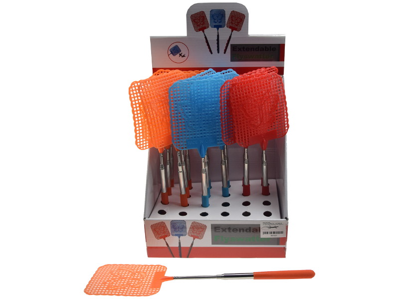 Práctico matamoscas con mango extensible de acero inoxidable y pala de plástico resistente. Ideal para eliminar insectos de forma rápida y eficaz. Disponible en varios colores vivos.