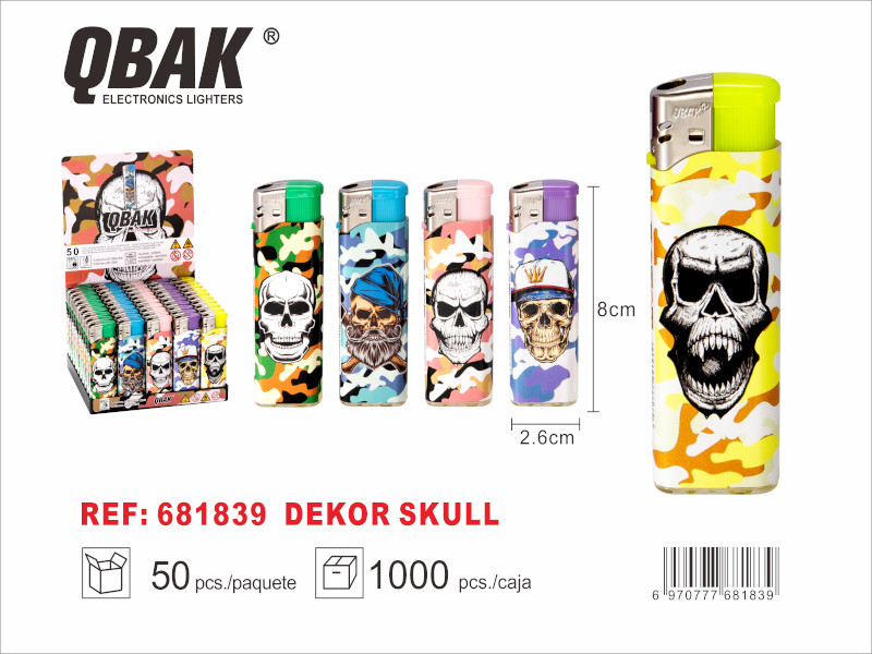 Diseños con calaveras en diferentes estilos y fondos de camuflaje colorido. Perfectos para quienes buscan un mechero con carácter y personalidad.Pack: 50 unidadesTamaño: 8 × 2,6 cm