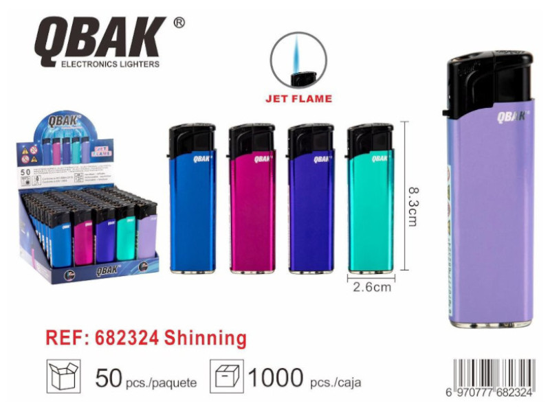 Diseño moderno y brillante con acabado metálico en colores surtidos. Llama tipo soplete ideal para mayor precisión y resistencia al viento.Pack: 50 unidadesTamaño: 8,3 × 2,6 cm