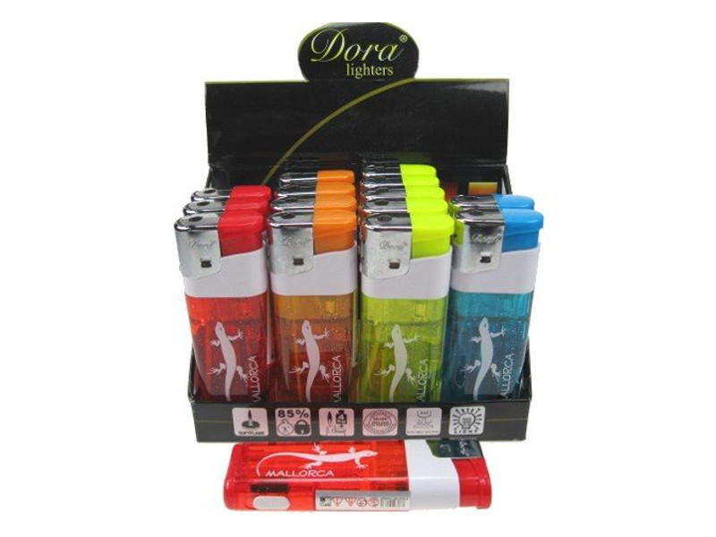 Mechero de gran tamaño con diseño de lagartija y el texto «Mallorca». Reutilizable, recargable e incluye linterna. Disponible en varios colores translúcidos.