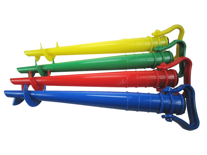 Anclajes de rosca para sombrillas, ideales para fijarlas firmemente en la arena o césped. Fabricados en plástico resistente. Colores surtidos.