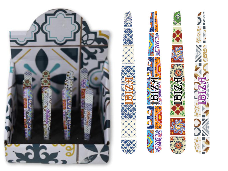 Pinzas de depilar con diseños inspirados en azulejos tradicionales y el nombre Ibiza serigrafiado. Estética cuidada y funcionalidad para el día a día o como detalle turístico.