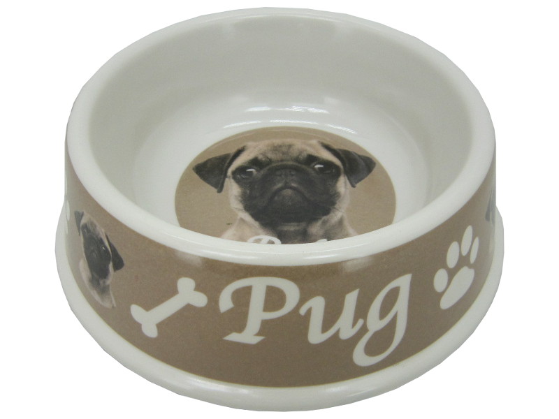 Original comedero fabricado en resistente plástico, ideal para los pequeños glotones de la casa. Su diseño está protagonizado por la encantadora imagen de un perro de raza Pug, impresa en el fondo y el lateral del cuenco. El comedero mide 21 cm de diámetro y 6,5 cm de altura, un tamaño perfecto para pienso o agua. Se sirve en lotes de 10 unidades.