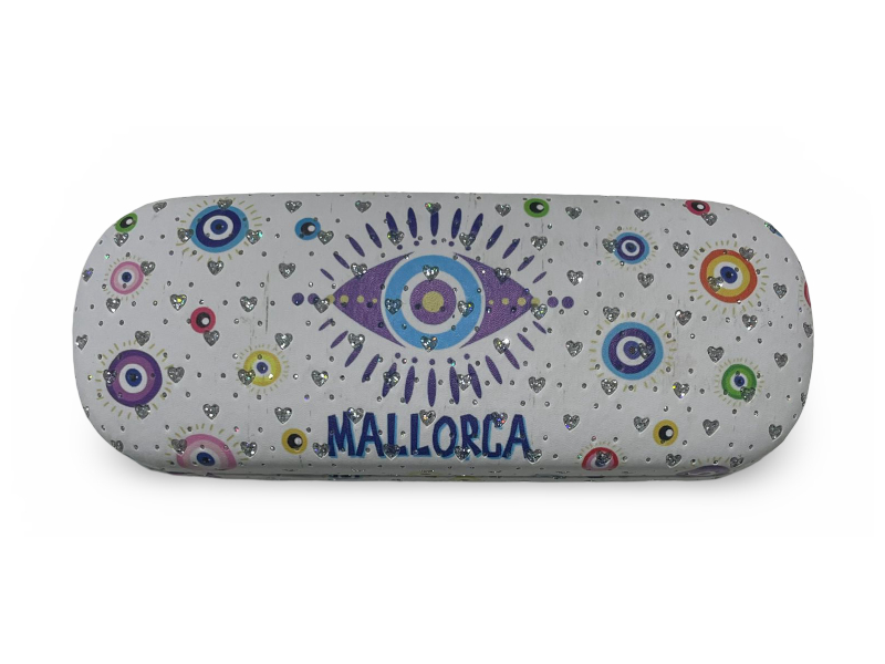 Estuche rígido decorado con un llamativo diseño de ojo turco en tonos morado, azul y amarillo, rodeado de corazones plateados y otros amuletos coloridos. La palabra “Mallorca” en azul vibrante refuerza el aire místico y alegre del diseño. Ideal para quienes buscan estilo y protección con un toque de simbolismo.