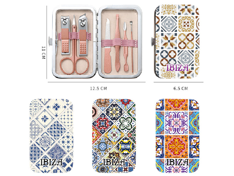 Completo estuche de manicura decorado con motivos de azulejos ibicencos. Incluye cortaúñas, tijeras, limas, empujadores y pinzas, todo organizado en un práctico estuche metálico. Ideal para el cuidado personal con un toque mediterráneo.