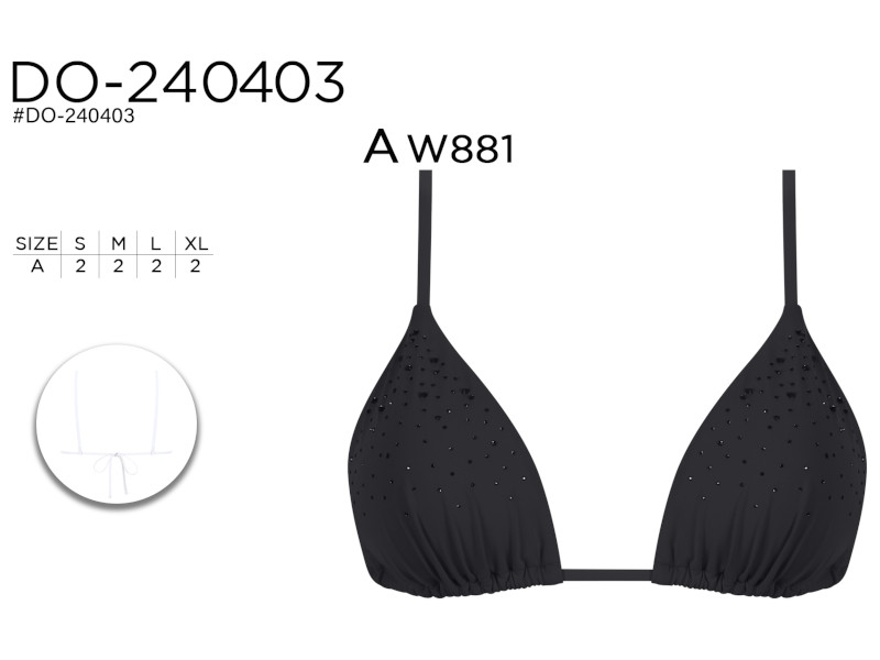 Diseño triangular con detalle fruncido en la base del pecho y apliques de cristales que aportan un brillo sutil. Sujeción mediante tirantes finos y lazada trasera para un ajuste cómodo y femenino.