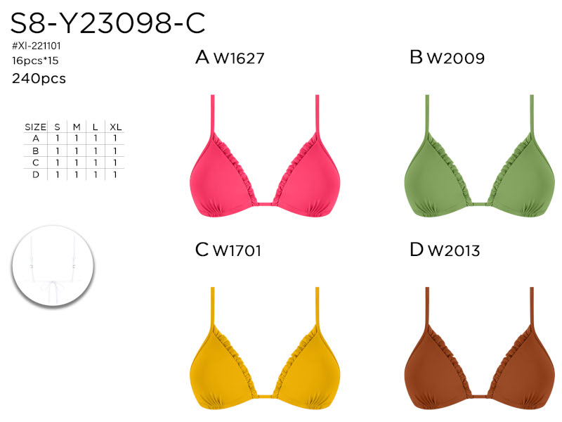 Top de bikini en forma de triángulo con tirantes finos y un elegante detalle fruncido a lo largo del lateral de las copas. Ajustable en la espalda con lazo para mayor comodidad. Disponible en una gama vibrante de colores lisos.