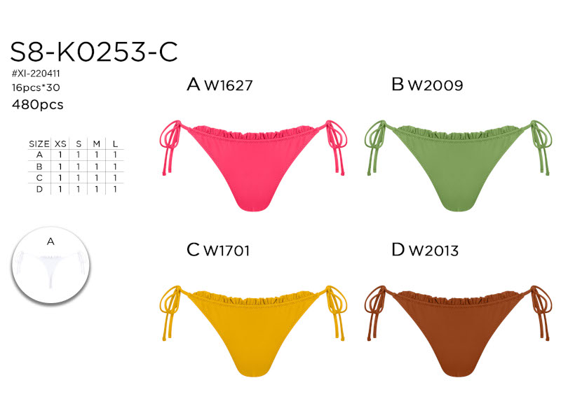 Tanga de bikini con lazo ajustable en los laterales y un distintivo fruncido con volante en la parte superior que aporta un toque decorativo y femenino. Disponible en una gama cálida de colores: rosa intenso, verde oliva, mostaza y marrón tierra.