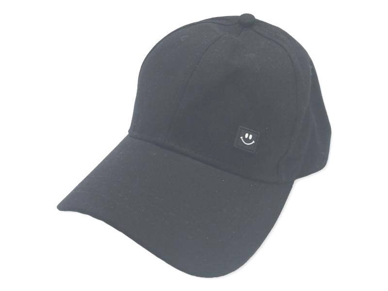 Gorra negra de estilo minimalista con pequeño parche frontal de cara sonriente. Diseño urbano, discreto y moderno, ideal para combinar con cualquier outfit casual. Ajustable y cómoda para uso diario.