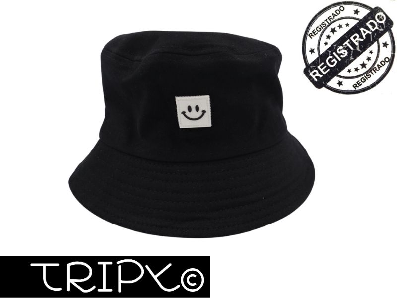 Gorro tipo bucket en color negro, decorado con un pequeño parche cuadrado bordado con una sonrisa en contraste. Diseño sencillo, moderno y juvenil, ideal para dar un toque casual y original a cualquier outfit.